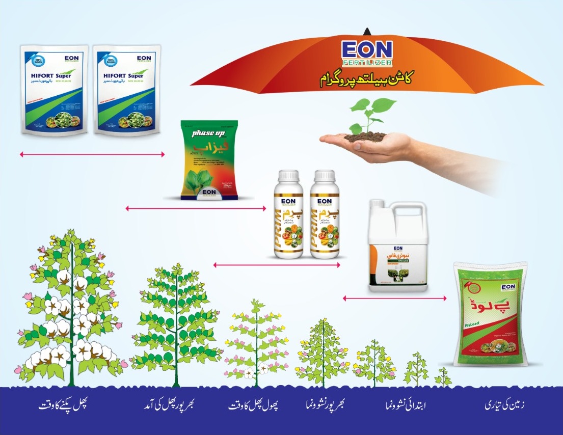 Cotton Growth Program Cotton Growth Program 1.Land Preparation (زمین کی تیاری)Payload ensures healthy soil and strong seedling emergence. 2.Early Vegetative Growth (ابتدائی نشوونما)Nutriphos builds strong stems and canopy for photosynthesis. 3.Flowering Stage (پھول آنے کا وقت)Prim promotes uniform flowering and boll initiation. 4.Fruit Development (پھل بننے کا وقت)Phase Up supports boll retention and reduces fruit drop. 5.Boll Maturity & Harvest (پھل پکنے کا وقت)Hifort Super increases boll size, improves fiber strength, and ensures maximum yield.📞 Contact UsFor expert advice and product availability:Phone: 0301-8603067, 022-3400322 | 061-6515412Email: info@eoncompanies.comWebsite: www.eoncompanies.com Interesting Topics On Cotton Our Products Prim Pay Load N Long Sizer View All GET THE VERY LATEST FROM EON Subscribe