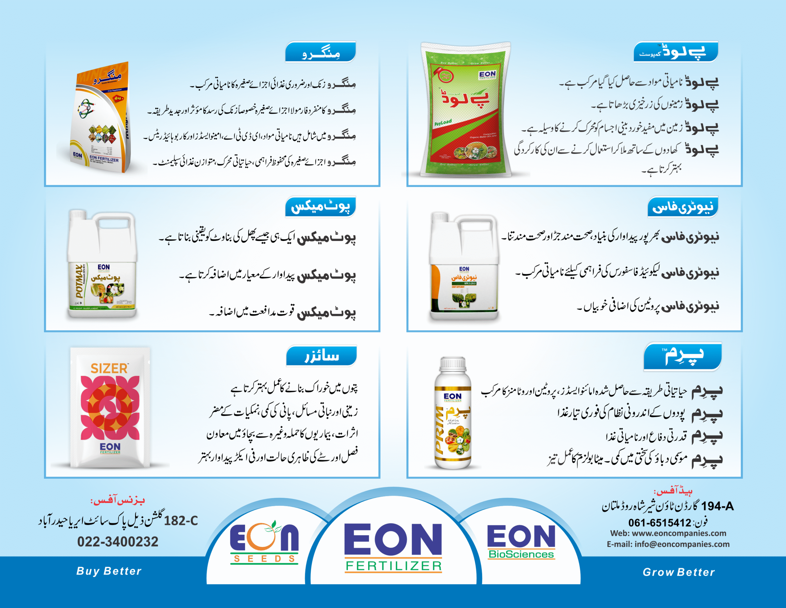 Maize Health Program Corn Growing Methods 1.Land Preparation (زمین کی تیاری)Crop Load ensures healthy germination and strong roots. 2.Early Growth Stage (پہلا مرحلہ)Mingro strengthens plant structure and leaf area for photosynthesis. 3.Vegetative & Pre-Tasseling Stage (دوسرا مرحلہ)Prim supports vigorous growth and prepares the crop for reproduction. 4.Tasseling & Silking Stage (تیسرا مرحلہ)Potmax ensures strong tassel and silk development for maximum kernel setting. 5.Grain Filling & Maturity (چوتھا مرحلہ)Sizer increases grain size and weight, giving bold, heavy cobs for higher profits.📞 Contact UsFor detailed crop guidance, contact EON Fertilizer:Phone: 0301-8603067, 022-3400322 | 061-6515412Email: info@eoncompanies.com Interesting Topics On Corn Our Products Prim Pay Load N Long Sizer View All GET THE VERY LATEST FROM EON Subscribe